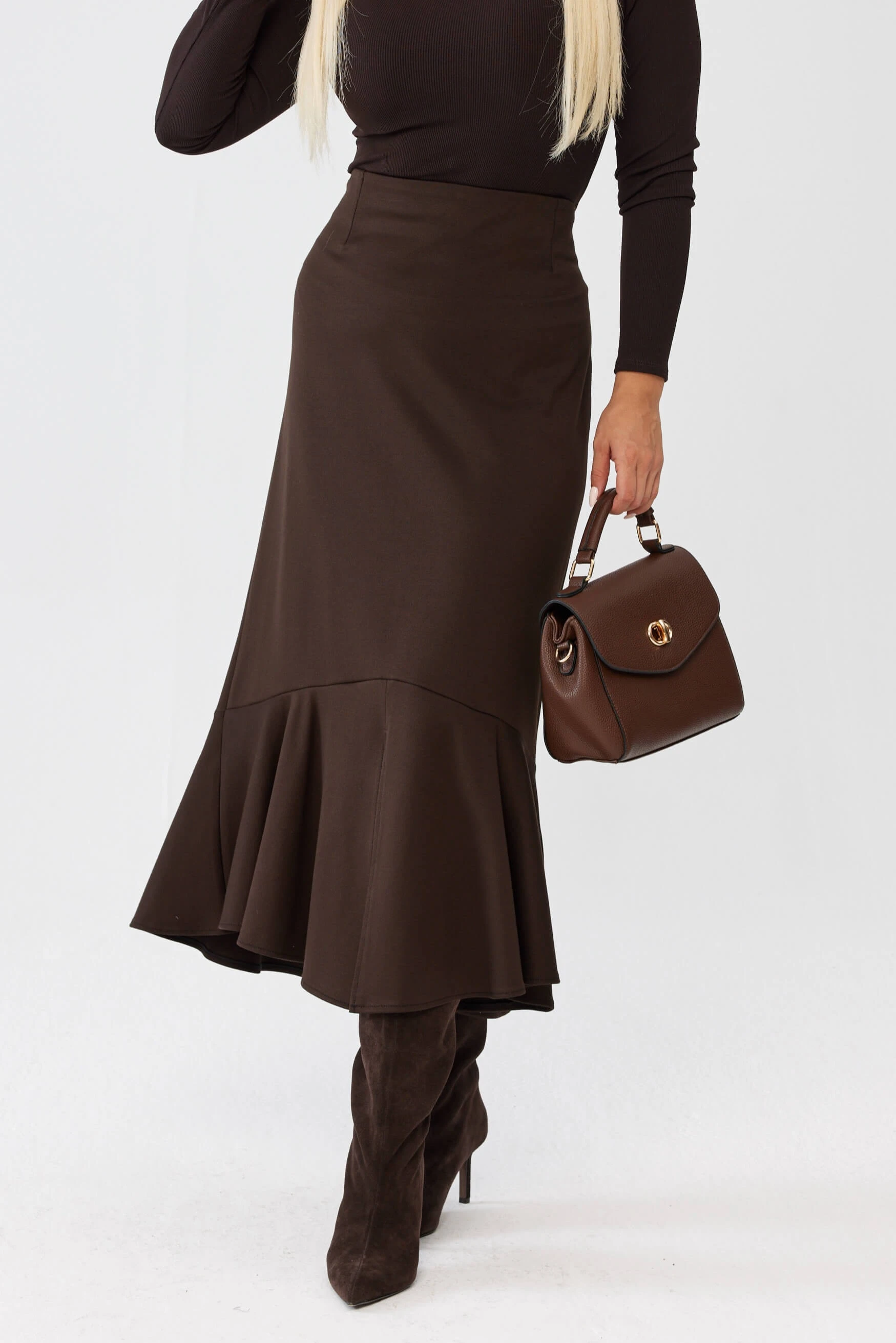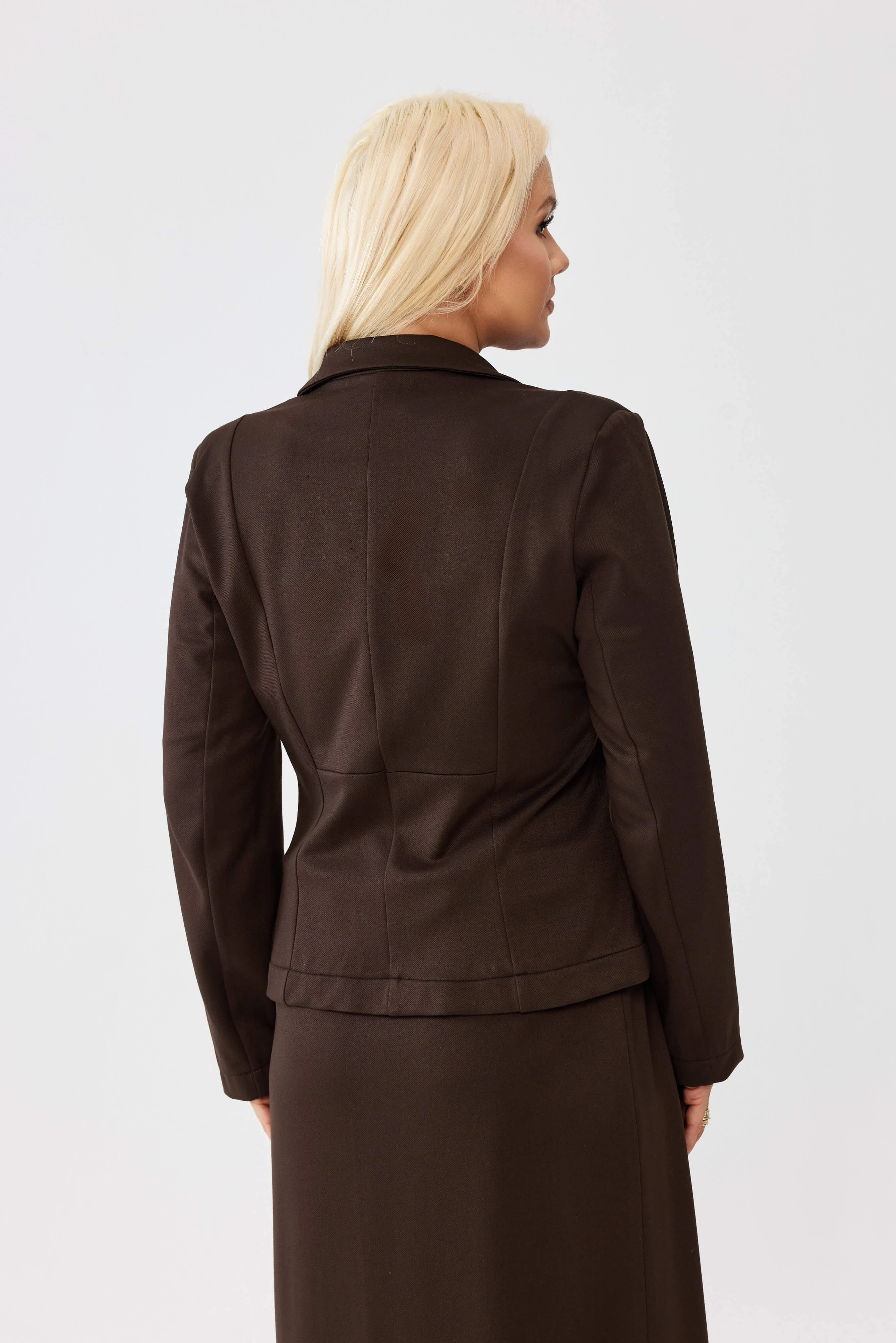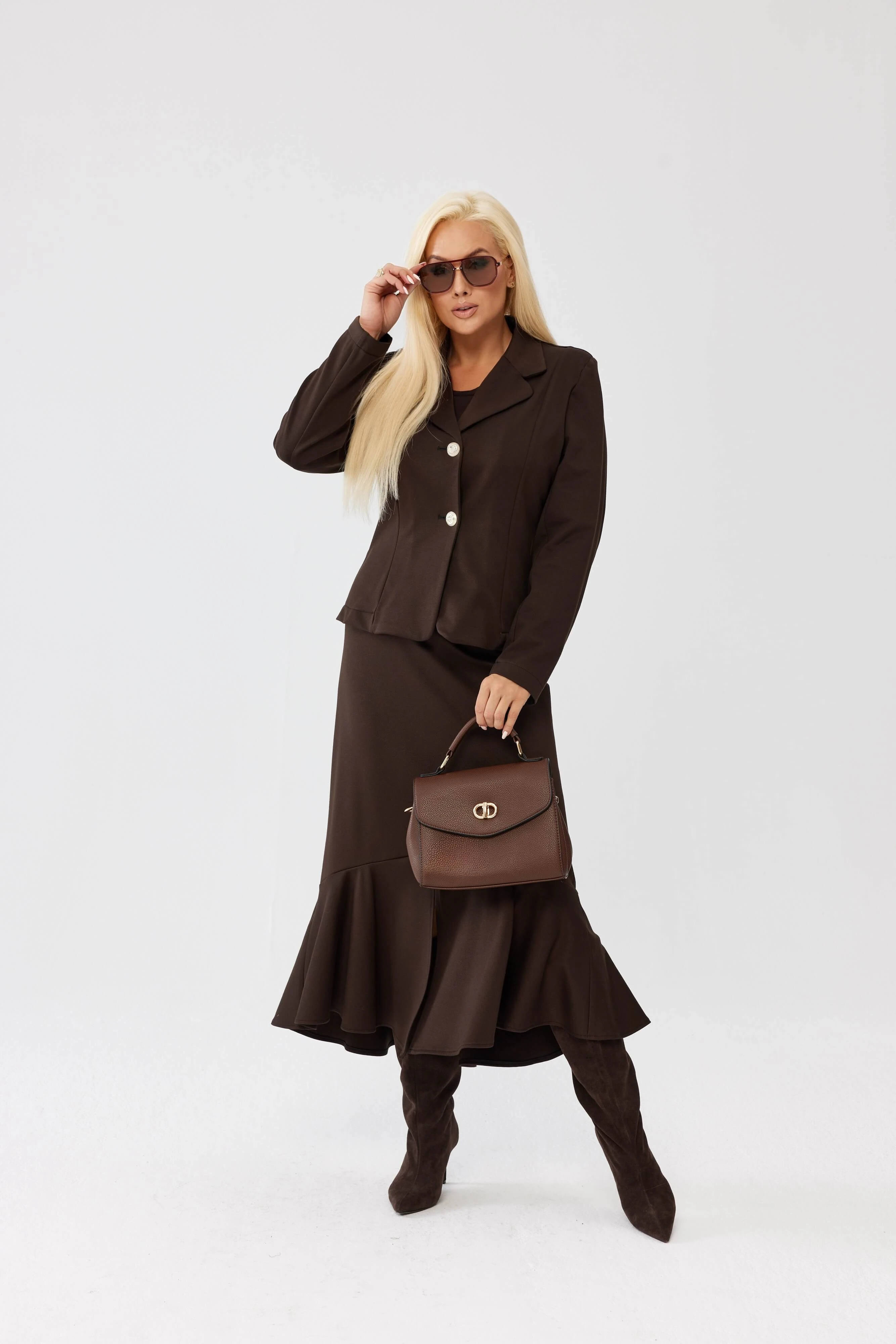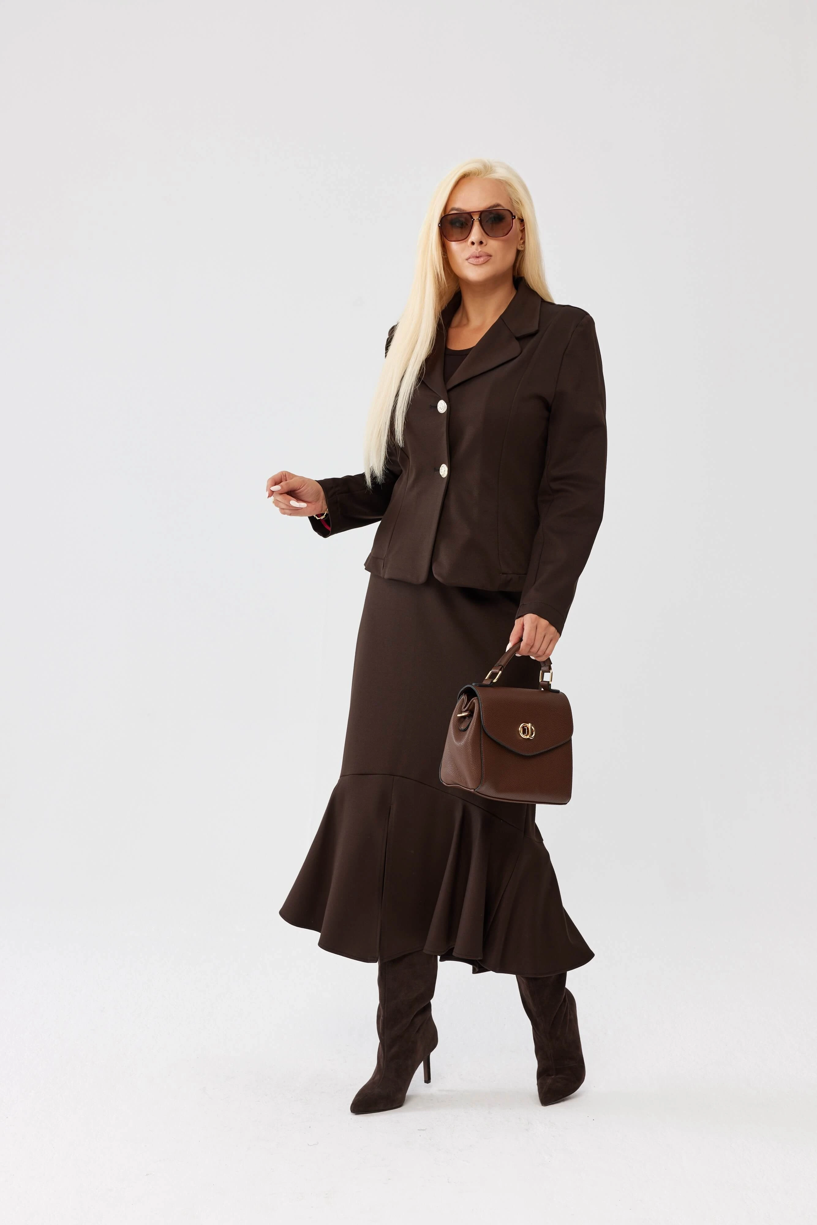 Czekoladowy komplet damski Adeline z taliowanym żakietem i spódnicą z falbaną PLUS SIZE XXL OVERSIZE WIOSNA