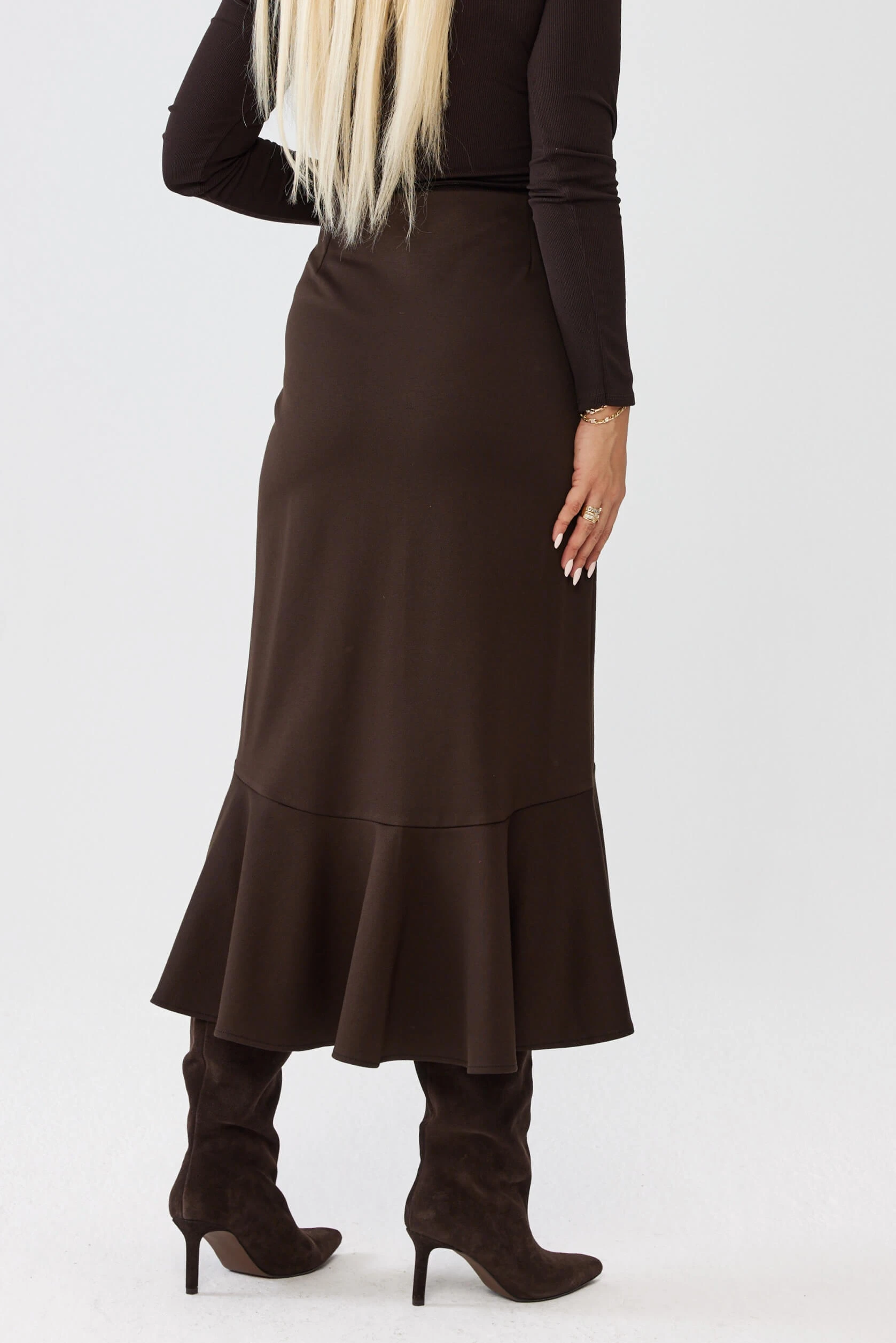 - Fantazyjna falbana na dole spódnicy dodaje dynamiki i lekkości. Podczas chodzenia subtelnie pracuje, dzięki czemu sylwetka wygląda bardziej miękko i elegancko.